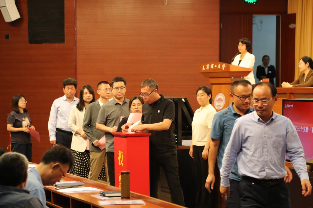 人事处主要负责同志对《天津理工大学岗位设置与聘用实施意见》《2025-2028年聘期全员岗位聘用实施方案》《天津理工大学绩效工资实施办法》三个审议稿拟定情况作说明。大会以无记名投票的方式对三个文件进行表决,最终均获高票通过。